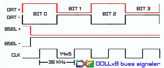 DAT+ and DAT- signals will be activated as soon as data is placed in the internal data buffer memory. DAT- goes positive and then activates the BSEL lines 3.5ms after the DAT lines are activated. The bus speed in DOLLx8 network is managed by the CLK signal and are currently set to 36kHz, which represents 14 milliseconds between each clock pulse. The bus clock is controlled by a positive BSEL- signal (BSEL + goes then simultaneously negative or low) and remains high as long as there is data in the data buffer memory. When data communication is completed and DAT receives HEX 0D 0A (CRLF) from the data buffer memory, the BSEL+ signal goes high again while BSEL signal goes low, which results in that the CLK signal ceases. The DOLLx8 system is then passively in standby or hibernation mode with minimal power consumption that leads to zero electromagnetic interference (EMI) in the network.