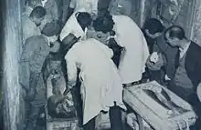 After their arrival, the men went to the Yaizu Public Hospital where the surgeon, Oi Toshiaki applied a zinc ointment to their faces and sent them home. On March 15, 1954, engineer Yamamoto, deckhand Masuda and 5 others which were said to make up the "elderly" members of the crew were sent to the Tokyo University Hospital for treatment.[14] There, they tested Masuda's bone marrow and found his white blood cell count at half the normal level.[15] Japanese biophysicist Nishiwaki Yasushi immediately traveled from Osaka to Yaizu to examine the crew and their boat. He quickly concluded that they had been exposed to radioactive fallout and wrote a letter to the chief of the US Atomic Energy Commission (AEC) asking for more information on how to treat the crew. The crew members, suffering from nausea, headaches, burns, pain in the eyes, bleeding from the gums, and other symptoms, were diagnosed with acute radiation syndrome. The US did not respond to Nishiwaki's letter or to letters from other Japanese scientists requesting information and help, although the United States did dispatch two medical scientists to Japan to study the effects of fallout on the ship's crew and to assist their doctors. The remaining crew members were quarantined in Yaizu North Hospital with all of their clothes and belongings buried on the property. High levels of radiation were found in the men's hair and nails, and so the hospital was forced to cut off the rest of their hair.[16]
