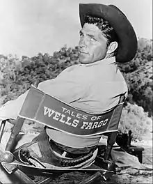 Described by TIME in 1959 as "probably the best horseman on television",[8] for most of his career, Robertson played in western films and television shows—well over 60 titles in all. Tales of Wells Fargo, his best-remembered series, aired on NBC from 1957 to 1961, when it moved to ABC and expanded to an hour-long program for its final season in 1961–1962. The show originally was produced by Nat Holt whom Robertson felt he owed his career to for giving him his first leading roles.[9] Robertson also did the narration for Tales of Wells Fargo through which he often presented his own commentary on matters of law, morality, and common sense. He was unique among his television contemporaries, stating that he hated the gun he was forced to carry, but saw it as a necessary evil, a "tool of the trade", and kept practicing. In its cover story on television westerns, published March 30, 1959, Time reported Robertson was 6 feet tall, weighed 180 pounds, and measured 42-34-34. He sometimes made use of his physique in "beefcake" scenes, such as one in 1952's Return of the Texan where he is seen bare-chested and sweaty, repairing a fence.[8]
