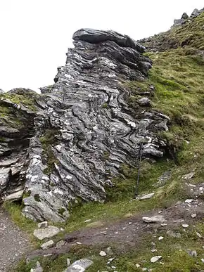 The Grampian orogeny folded the sequence in mainland Scotland into a series of major tight folds with NE-SW aligned fold axes. Much of the southeastern part of the outcrop forms a part of the Tay Nappe and involves the inversion of a large part of the succession. Caledonoid faulting on NE-SW lines affects the sequence across the entire area.[6]
