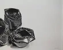 Pyle's media initially include paintings in oil and acrylic, and, during a later period, murals for public spaces. After several phases, in which he also experimented with ink and pencil, as well as pastels and watercolors, Pyle finally found charcoal as the medium of his choice.[5] In addition to focusing on the human body there are unexpected and aged objects that he transforms into his charcoal compositions. So, in addition to living figures, old teapots to rusted motorcycles become his models to which he gives a new identity through the use of contrast, negative space and isolation. The anonymity that his art is reflecting are subject and intention at the same time.[6]