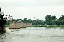 The city is across the river from Sinŭiju, North Korea. The two cities are connected by the Sino–Korean Friendship Bridge. Less than 100 meters downstream is the Yalu River Broken Bridge which was destroyed by American bombing during the Korean War. Tourists can rent speed boats or passenger boats to approach the border and get a closer look at the North Korean city of Sinŭiju. There is a Ferris wheel in Sinŭiju visible from across the Yalu River.