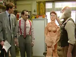 Back at the Nag's Head, Trigger complains about the "fresh Jersey" tomatoes, and Boycie turns out to be the one who bought the bulk of Del's faulty video recorders. Denzil comes bursting in and tells them about the dolls and how he has to get in touch with Del. Boycie and Mike cackle nastily on hearing that Del has fifty time bombs on his hands.