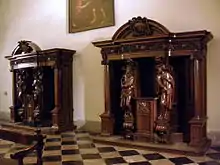 The only work that has been signed by van Vlierden are seven confessionals that he made for the Dominican church in Maastricht and are now in the Basilica of Saint Servatius. One of the seven confessionals has a sculpture of King David holding a harp. On the body of the harp is written: d. van vlierden fecit hasselen. This ensemble can be dated between 1695 and 1706 on the basis of the dates that are painted on the confessionals. The iconography of the confessionals constitutes a coherent whole.[1] This was in line with the requirements of the Counter-Reformation which demanded that artists created paintings and sculptures in church contexts that would speak to the illiterate rather than to the well-informed. The Counter-Reformation stressed certain points of religious doctrine, as a result of which certain church furniture, such as the confessional gained an increased importance.[4] The Dominicans for whom van Vlierden made the confessionals in Maastricht also subscribed to the view that the confessionals should clarify the deeper meaning of the confession to the faithful. A similar programmatic scheme of confessionals and interior decoration had been implemented previously in the St. Paul's Church in Antwerp. The seven Maastricht confessionals follow this example.