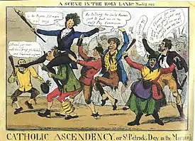 Against the charge of political dictation from Rome, O'Connell insisted that the Catholic Church in Ireland "is a national Church". At the same time, he openly declared that "if the people rally to me they will have a nation for that Church".[26] For O'Connell Catholicism defined the nation for which he sought both a civil and political emancipation. The "positive and unmistakable" mark of distinction between Irish and English, according to O'Connell's newspaper, the Pilot, was "the distinction created by religion".[27]
