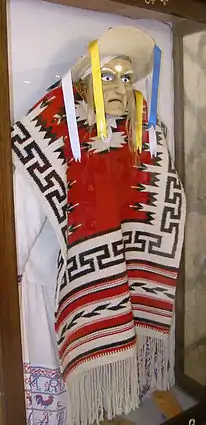 A Danzante wears a top and bottom made out of a white blanket. It is topped with a "Sarape," which is a blanket worn as a cloak in Latin America. Each Serape contains different designs and colors. They wear a hat made out of straw with adorned lengthy pieces of ribbon, each one a different color. The ribbon is parted down the middle of the hat, each one hanging 10 cm on the sides. Their shoes are sandals that have a wooden sole in order to make a tapping noise throughout their dance, followed by a wooden cane they also use. The dancers also wear a mask made out of either wood, cornstalk paste, or clay with an elderly man's face painted on it.