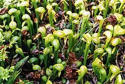 Darlingtonia californica is a carnivorous plant, commonly known as the cobra lily, which traps insects in its hollow tubular leaves, whose top is flared into a hollow dome with a forked "tongue" that gives the species its common name. In late spring, they bear purple and yellow flowers that rise above the green cobra-like leaves. Darlingtonia are found only in wet meadows and bogs with acidic soils low in nitrogen. The rare, strangely shaped plant is the only member of the pitcher plant family Sarraceniaceae in Oregon.[2]