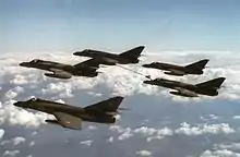 In total, three operational squadrons and a training unit were equipped with the Super Étendard.[6] The Super Étendards would operate from both of France's aircraft carriers at that time, Clemenceau and Foch; either carrier's air wing typically comprised 16 Super Étendards, 10 F-8 Crusaders, 3 Étendard IVPs, 7 Breguet Alizé anti-submarine aircraft, as well as numerous helicopters.[37]