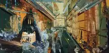 Brewster often paints directly from the subject, creating works in a single pass in the spirit of the American Action painters of the mid 20th century. “He sits within a tradition the French call premier coup,” writes artist Stuart Shils,” meaning ‘all at once,’ an attitude toward work in which the graphic urgency of improvisation response underscores all decisions and informs the energy of the mark making.”[2] Painter Anne Neely writes “it is as if each painting is chiseled with intensity and speaks to the desire on the part of the artist to find a way ‘into and through’ the space of the scene before him.”[3] Mostly utilizing a variety of rollers to apply paint to canvas, Brewster opts for a brash, acid palette and aggressively works the surface with broad strokes of pigment.[4] Poet and art critic Gerrit Henry writes that “the trick to Brewster, as it was indeed with the Abstract Expressionists, is this very painterly romanticism, called up from psychic depths and executed with an overwhelming conviction.”[5]
