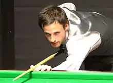 Gilbert saw off Rod Lawler 5–0, Zhou Yuelong 5–2 and Zhang Anda 5–0 to play in the quarter-finals of the World Open, where he was beaten 5–2 by Neil Robertson.[33] He had a pair of 6–2 victories over Adam Duffy and Mark Joyce at the UK Championship and made two centuries from 3–0 down against Ali Carter to edge through 6–5.[34] Gilbert lost 6–2 to Jamie Jones in the fourth round. He won two matches to qualify for the German Masters and eliminated Marco Fu 5–3 in the first round, but was then defeated 5–4 by Stuart Bingham despite holding a 4–2 advantage at one stage.[35][36] After being 6–1 up on Fergal O'Brien in the final qualifying round for the World Championship the scores were locked at 9–9. The decider took 123 minutes and 41 seconds, breaking the record for the longest frame in snooker history, with O'Brien taking it on the final brown.[37] Nevertheless, his end of season ranking of 19 is the highest he has ever ended a campaign.[38]