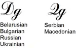In italic (Russian) type, the lowercase form looks more like the lowercase Latin ⟨d⟩, or a numeral "6" flipped horizontally: ⟨д⟩. Southern (Serbian, Bulgarian, Macedonian) typography may prefer a variant that looks like a lowercase Latin ⟨g⟩. Cursive lowercase De has the same two shapes, but with a different distribution: for example, the g-shaped variant is a standard for Russian schools.[1]