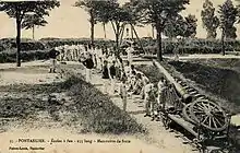 The first engagement of the 155 L was probably by the 8th Foot Artillery Regiment firing from place fortifiée d'Épinal during the Battle of the Mortagne on August 27. The first artillery duels of the war quickly convinced the French of their inferiority in heavy artillery relative to the Germans. Thus it was seen necessary to enhance the mobility of their 155 mm guns. In October 1914, a program was started to fit the 155 L wheels with a system of metallic soles and gutters articulated together.[1] The use of this system—known as cingoli or Bonagente wheel belts after the name of their Italian inventor[3]—eliminated the laborious construction of wooden platforms. The cingoli tracks added 800 kilograms to the gun's total weight, but saved 5 tons of bedding material that otherwise had to be transported for the wooden platforms. The use of cingolis also reduced the time required to deploy the 155 mm gun from 5–6 hours to just one hour.[1]