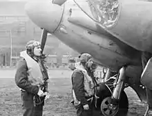 As a day and night fighter, prototype W4052 was equipped with AI Mk IV equipment, complete with an "arrowhead" transmission aerial mounted between the central Brownings and receiving aerials through the outer wing tips, and it was painted in black RDM2a "Special Night" finish.[56][nb 10] It was also the first prototype constructed with the extended engine nacelles.[58] W4052 was later tested with other modifications, including bomb racks, drop tanks, barrage balloon cable cutters in the leading edge of the wings, Hamilton airscrews and braking propellers, and drooping aileron systems that enabled steep approaches and a larger rudder tab. The prototype continued to serve as a test machine until it was scrapped on 28 January 1946.[7] 4055 flew the first operational Mosquito flight on 17 September 1941.[59]