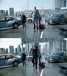 Digital Domain (DD), Atomic Fiction, Blur Studio, Weta Digital, Rodeo FX, and Luma Pictures produced Deadpool's visual effects.[23] Reynolds credited Miller and his visual effects experience with producing a film that looked like others made with bigger budgets.[78] Motion capture supervisor Greg LaSalle agreed, noting that Miller held off working on the CGI for Colossus until after the film was edited to avoid spending money on shots that would not be used.[84] Miller worked with visual effects supervisor Jonathan Rothbart to design and complete the film's 1500 effects shots—700 more than originally planned. 800 of them were completed in the last four weeks of production.[85]