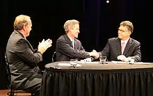 Despite entering the race late, Barkley was polling as high as 19% by October 1.[12] The campaign also produced two statewide radio ads featuring Barkley and Ventura.[13] Barkley, unlike many third-party and independent candidates, was included in public debates with the major party nominees; the first of five three-way debates took place October 5.[14] He received the endorsement of former U.S. Representative Tim Penny.[15] Numerous polls showed that Barkley would affect the outcome of the race.[16] Barkley raised $163,358 for his campaign (less than 1% of each of his opponents' totals).[17] He received over 435,000 votes, about 15% of the total, significantly affecting a race in which Franken defeated Coleman by only 312 votes.[18][19]