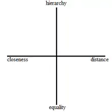 In this model, the vertical axis represents the level of power in the interaction, and the horizontal axis represents connection. Having presented this model, Tannen proposed that in the American paradigm, a sibling relationship would be mapped in the bottom left quadrant, as there is a high level of closeness and a relative equality that is not comparable to the power dynamic in an American parent/child relationship.[3] Using this new model, Tannen argues that connection maneuvers do not only occur independently of control maneuvers. Among other examples, she mentions a wife who refuses to let her husband take over making popcorn by saying "You always burn it".[3] According to Tannen, the wife's resistance to her husband's request is a control maneuver, but by citing a potential undesirable effect for her family (i.e. burnt popcorn), she ties a connection maneuver into her attempt to enforce a decision.