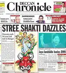 Deccan Chronicle is an Indian English-language daily newspaper founded by Rajagopal Mudaliar in the 1930s & currently owned by SREI.[3] It is published in Hyderabad, Telangana, by Deccan Chronicle Holdings Limited (DCHL). The newspaper's name derives from the originating place, the Deccan regions of India. Deccan Chronicle has eight editions in Andhra Pradesh and Telangana. They also publish from Chennai and Bengaluru.[4]