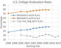 Community colleges have the mission to provide better access to higher education and graduation for under-served populations. Greater access and success in post-secondary education is a primary element for decreasing income inequalities and increasing the productivity of America's workers.[8] In 2008, 46% of all undergraduate students in the US attended community colleges.[9] Long and Kurlaender studied the graduation differences between community colleges and universities and found that community college students were 14.5% less likely to complete their degree within 9 years as opposed to students in universities.[10] Recent research studied the effect of incentive payments at community colleges and found that they increased the likelihood of low-income students enrolling in the second semester after random assignment and total number of credits earned, with program group students completing nearly 40 percent more credits.[11] Other recent research shows other methods of increasing graduation and persistence rates. Century College in Minnesota implemented GPS Lifeplan to help develop goals in areas such as education, leadership, and finance. The concepts in GPS Lifeplan are integrated in many areas of the college such as New Student Seminars and other areas of curriculum. New full-time student using GPS Lifeplan retention rates were 81% compared to overall retention of 72%.[12]