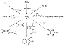 Yus and his co-workers synthesized various lithium naphthalenide compounds that acts as a catalyst for lithiation of different functionalized halogenated arenes. The Li-arene reacted with water or deuterium to produce the dehalogenated product.[5][6][7] The major drawback of using lithium naphthalene catalysts is that it is hard to separate from the reaction mixture because naphthalene adsorbs on surface of arene substrates. In polymer chemistry, sodium metal has been used for dehalogenation process.[8][9] Removal of halogen atom from arene-halides in the presence of Grignard agent and water for the formation of new compound is known as Grignard degradation. Dehalogenation using Grignard reagents is a two steps hydrodehalogenation process. The reaction begins with the formation of alkyl/arene-magnesium-halogen compound, followed by addition of proton source to form dehalogenated product. Egorov and his co-workers have reported dehalogenation of benzyl halides using atomic magnesium in 3P state at 600°C. Toluene and bi-benzyls were produced as the product of the reaction.[10] Morisson and his co-workers also reported dehalogenation of organic halides by flash vacuum pyrolysis using magnesium.[11]