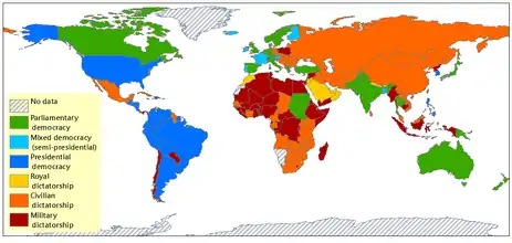 A presidential democracy has a government that does not need the majority support of a legislature to stay in power. A semi-presidential (mixed) democracy has a government that needs the majority of support from a legislature to exist and whose head of state is popularly elected for a fixed term. Parliamentary democracy is the same as semi-presidential but has heads of state which are not popularly elected for a fixed term, typically either monarchs or officials not chosen by popular elections. [9]:457