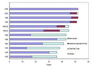 The Democrat Party made its best showings in parliament in 1948, 1976, and 1996. It has never won an outright parliamentary majority. The party's electoral support bases are southern Thailand and Bangkok, although election results in Bangkok have fluctuated widely. Since 2004, Democrat candidates won three elections for the governorship of Bangkok. From 2005 to 2019, the Democrat Party was led by Abhisit Vejjajiva, former prime minister.