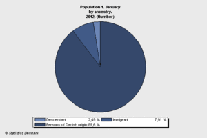 According to 2017 figures from Statistics Denmark, 86.9%[2][3] of Denmark's population of over 5,760,694 was of Danish descent, defined as having at least one parent who was born in Denmark and has Danish citizenship.[4][2] The remaining 13.1% were of a foreign background, defined as immigrants or descendants of recent immigrants. With the same definition, the most common countries of origin were Poland, Turkey, Germany, Iraq, Romania, Syria, Somalia, Iran, Afghanistan, and Yugoslavia and its successor states. More than 752,618 individuals (13.1%)[2][3] are migrants and their descendants (146,798 second generation migrants born in Denmark[3]).