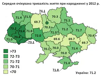 Death rates also vary widely by region; Eastern and southern Ukraine have the highest death rates in the country, and the life expectancy for children born in Chernihiv, Dnipropetrovsk, Donetsk, Kherson, Kropyvnytskyi, Luhansk, Mikolaiv, and Odessa regions is 1.5 years lower than the national average.[60]