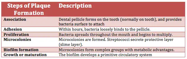 Dental plaque is a biofilm that attaches to tooth surfaces, restorations and prosthetic appliances (including dentures and bridges) if left undisturbed. Understanding the formation, composition and characteristics of plaque helps in its control.[5] An acquired pellicle is a layer of saliva that is composed of mainly glycoproteins and forms shortly after cleaning of the teeth or exposure of new teeth.[6] Bacteria then attach to the pellicle layer, form micro-colonies, and mature on the tooth, which can result in oral diseases. The following table provides a more detailed (six-step) explanation of biofilm formation:
