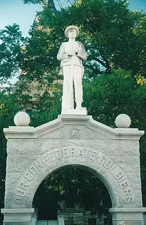 The statue depicts an armed Confederate soldier standing on an arch with the inscription, "Our Confederate Soldiers".