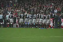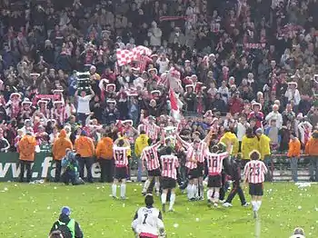 With finances secured, the club became the first in Ireland to be awarded a premier UEFA licence in 2004.[33] Derry re-introduced professional football and its form improved,[34] as it finished second in 2005.[35] Derry's 2005 League Cup victory also saw the club qualify for the cross-border Setanta Cup for the first time in 2006.[36][37] It entered the 2006–07 UEFA Cup's preliminary rounds, beating IFK Göteborg and Gretna to reach the first round where it faced Paris Saint-Germain;[17] after a home 0–0 draw it lost 2–0 away.[38] Derry finished second again in 2006,[39] but went on to win the FAI Cup and League Cup double.[40][41] It qualified for the 2007 Setanta Cup, as well as the preliminary rounds of the 2007–08 UEFA Champions League,[42] and was accepted into the restructured Premier Division for 2007.[43] The club had a disappointing league campaign in 2007, finishing seventh despite being pre-season favourites.[44] It did manage to win its eighth League Cup, though, thanks to a 1–0 victory over Bohemians at the Brandywell.