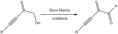 In one example of the Dess–Martin oxidation, involves transforming a sensitive α-β-unsaturated alcohol to its corresponding aldehyde. This moiety has been found in several natural products and due to its high functionality, it could be a valuable synthetic building block in organic synthesis. Thongsornkleeb and Danheiser oxidized this sensitive alcohol by employing the Dess Martin Oxidation and altering the work up procedure (diluting with pentanes, washing with poly(4-vinylpyridine) to remove the acetic acid generated during the reaction, filtering and concentrating via distillation.[12]