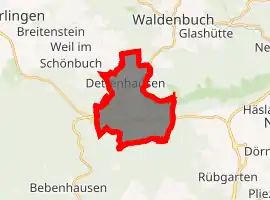 Dettenhausen is a village in the administrative district (Kreis) of Tübingen, in the Schönbuch Nature Park. It is located 11 km north of Tübingen, and about 25 km south of Stuttgart, the capital of Baden-Württemberg. Dettenhausen was first officially mentioned in the Codex Hirsaugiensis in around 1100 AD as "Detenhusen". Dettenhausen has 5.441 citizens (as of December 31, 2013). Dettenhausen's coat of arms is a red deer against a yellow background with a yellow ear of grains against a red background.