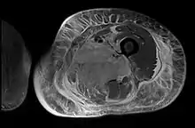 Creatine kinase may be normal or increased probably depending upon the stage of the condition when sampling is undertaken. ESR is elevated. Planar X-ray reveals soft tissue swelling and may potentially show gas within necrotic muscle, Bone scan may show non specific uptake later in the course. CT shows muscle oedema with preserved tissue planes (non-contrast enhancing). MRI is the exam of choice and shows increased signal on T2 weighted images within areas of muscle oedema. Contrast enhancement is helpful but must be weighed against the risk of Nephrogenic Systemic Fibrosis as many diabetics have underlying chronic kidney disease. Arteriography reveals large and medium vessel arteriosclerosis occasionally with dye within the area of tissue infarction. Electromyography shows non specific focal changes.
