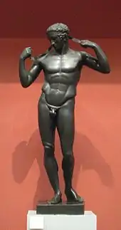 Both Pliny's Natural History and Lucian's Philopseudes[2] described Roman marbles of a Diadumenos copied from Greek originals in bronze, yet it was not recognized until 1878[3] that the Roman marble from Vaison-la-Romaine (Roman Vasio) in the British Museum and two others recreate the lost Polyclitan bronze original.[4] Pliny recorded that the Polyclitan original fetched at auction the extraordinary price of a hundred talents, an enormous sum in Antiquity, as Adolf Furtwängler pointed out.[5] Indeed, Roman marble copies must have abounded, to judge from the number of recognizable fragments and complete works, including a head at the Louvre, a complete example at the Metropolitan Museum of Art, another complete example at the Prado Museum, and another complete example of somewhat different character, the somewhat below lifesize Roman marble Farnese Diadumenos at the British Museum, which preserves the end of the ribband falling from the right hand. Another version in the British Museum, slightly damaged but in otherwise reasonable condition, is from Vaison in France. Freer versions were executed in reduced scale as bronze statuettes,[6] and the head of Diadumenos-type appears on numerous Roman engraved gems.[7]