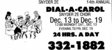 Dial-A-Carol is an annual student-run service at the University of Illinois at Urbana–Champaign in which students take calls from people asking for a Christmas carol. It is run out of Snyder Hall, a residence hall in the Ikenberry Commons on campus. Students and staff volunteer to take calls around the clock for one week straight, every year during finals week of every Fall semester.[1] As of 2015 Dial-A-Carol entered its 56th season,[2] in which it garnered national attention from sources such as ABC News,[3] and Jimmy Kimmel Live.[4] USA Today College wrote that Dial-A-Carol shattered previous records by receiving over 10,000 calls in 2015 for one-week span.[5]