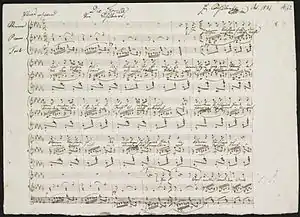 After completing his original in 1817, Schubert made six subsequent autographs.[lower-alpha 2] These differing versions were not necessarily an attempt to improve a work, with some later versions being written from memory with only minor variations; Newbould considers that Schubert's close replication was a "feat of musicianship ... and a sign that Schubert spoke the language of music with the naturalness of conversation."[25] The differences between the autographs are small: according to Reed, they "are concerned ... with the tempo indication and the prelude – postlude."[4] The first version, marked Mässig,[lower-alpha 3] has no introduction, although "the shape of the familiar introduction is already adumbrated in a seven-bar postlude".[4] The draft is undated, although is from 1817 and is kept in the Stadler, Ebner and Schindler collection in Lund.[4] A second copy, written in May or June 1817, was for Franz Sales Kandler's album: this version was marked Nicht zu geschwind (not too fast).[4][6]