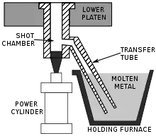 These are used when the casting alloy cannot be used in hot-chamber machines; these include aluminium, zinc alloys with a large composition of aluminium, magnesium and copper. The process for these machines start with melting the metal in a separate furnace.[15] Then a precise amount of molten metal is transported to the cold-chamber machine where it is fed into an unheated shot chamber (or injection cylinder). This shot is then driven into the die by a hydraulic or mechanical piston. The biggest disadvantage of this system is the slower cycle time due to the need to transfer the molten metal from the furnace to the cold-chamber machine.[16]