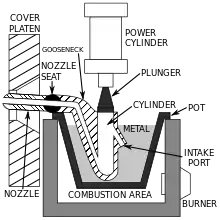 Hot-chamber die casting, also known gooseneck machines, rely upon a pool of molten metal to feed the die. At the beginning of the cycle the piston of the machine is retracted, which allows the molten metal to fill the "gooseneck". The pneumatic- or hydraulic-powered piston then forces this metal out of the gooseneck into the die. The advantages of this system include fast cycle times (approximately 15 cycles a minute) and the convenience of melting the metal in the casting machine. The disadvantages of this system are that it is limited to use with low-melting point metals and that aluminium cannot be used because it picks up some of the iron while in the molten pool. Therefore, hot-chamber machines are primarily used with zinc-, tin-, and lead-based alloys.[14]