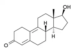 Dienolone (developmental code name RU-3118; online product names Trenazone,[1] Dienazone), or nordienolone, also known as 19-nor-δ9(10)-testosterone, δ9(10)-nandrolone, or estra-4,9(10)-dien-17β-ol-3-one, is a synthetic anabolic-androgenic steroid (AAS) of the 19-nortestosterone group that was never marketed.[2] It has been found to possess slightly lower affinity for the androgen receptor (AR) and progesterone receptor (PR) relative to nandrolone in rat and rabbit tissue bioassays, whereas trenbolone was found to possess the same affinity for the AR as dienolone but several-fold increased affinity for the PR.[3] Dienedione (the 17-keto analogue of dienolone, also known as 19-nor-4,9-androstadienedione) is thought to be a prohormone of dienolone,[4] while methyldienolone and ethyldienolone are orally active 17α-alkylated AAS derivatives of dienolone.[5][6] In contrast, dienogest, the 17α-cyanomethyl derivative of dienolone, is a potent progestogen and antiandrogen.[7]