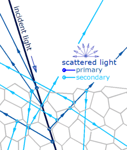 The most general mechanism by which a surface gives diffuse reflection does not involve exactly the surface: most of the light is contributed by scattering centers beneath the surface,[2][3] as illustrated in Figure 1. If one were to imagine that the figure represents snow, and that the polygons are its (transparent) ice crystallites, an impinging ray is partially reflected (a few percent) by the first particle, enters in it, is again reflected by the interface with the second particle, enters in it, impinges on the third, and so on, generating a series of "primary" scattered rays in random directions, which, in turn, through the same mechanism, generate a large number of "secondary" scattered rays, which generate "tertiary" rays, and so forth.[4] All these rays walk through the snow crystallites, which do not absorb light, until they arrive at the surface and exit in random directions.[5] The result is that the light that was sent out is returned in all directions, so that snow is white despite being made of transparent material (ice crystals).