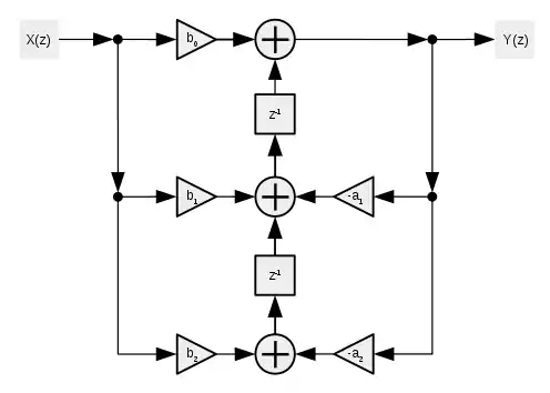 The direct form 1 implementation requires four delay registers. An equivalent circuit is the direct form 2 implementation, which requires only two delay registers: