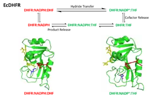 The catalytic cycle of the reaction catalyzed by DHFR incorporates five important intermediate: holoenzyme (E:NADPH), Michaelis complex (E:NADPH:DHF), ternary product complex (E:NADP+:THF), tetrahydrofolate binary complex (E:THF), and THF‚NADPH complex (E:NADPH:THF). The product (THF) dissociation step from E:NADPH:THF to E:NADPH is the rate determining step during steady-state turnover.[21]