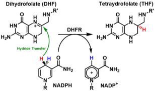 DHFR catalyzes the transfer of a hydride from NADPH to dihydrofolate with an accompanying protonation to produce tetrahydrofolate.[14] In the end, dihydrofolate is reduced to tetrahydrofolate and NADPH is oxidized to NADP+. The high flexibility of Met20 and other loops near the active site play a role in promoting the release of the product, tetrahydrofolate. In particular the Met20 loop helps stabilize the nicotinamide ring of the NADPH to promote the transfer of the hydride from NADPH to dihydrofolate.[11]