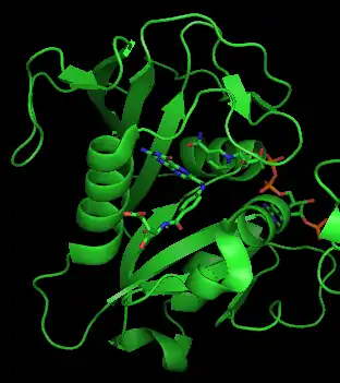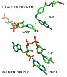 - Filman DJ, Bolin JT, Matthews DA, Kraut J (November 1982). "Crystal structures of Escherichia coli and Lactobacillus casei dihydrofolate reductase refined at 1.7 Å resolution. II. Environment of bound NADPH and implications for catalysis". The Journal of Biological Chemistry. 257 (22): 13663–72. doi:10.1016/S0021-9258(18)33498-7. PMID 6815179.