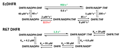 - Fierke CA, Johnson KA, Benkovic SJ (June 1987). "Construction and evaluation of the kinetic scheme associated with dihydrofolate reductase from Escherichia coli". Biochemistry. 26 (13): 4085–92. doi:10.1021/bi00387a052. PMID 3307916.