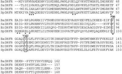 BaDHFR's resistance to trimethoprim analogs is due to these two residues (F96 and Y102), which also confer improved kinetics and catalytic efficiency.[47] Current research uses active site mutants in BaDHFR to guide lead optimization for new antifolate inhibitors.[47]