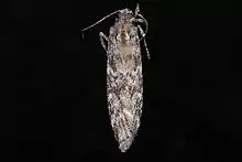 The wingspan is 9.5–11 mm.[8] The forewings are brownish grey with black zigzag lines, bordered by white. The hindwings are light brownish grey with a pale fringe. Adults are on wing from June to August in one generation per year.
