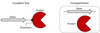 When functional proteins have been isolated, it is necessary that their genes are too, therefore a genotype-phenotype link is required.[24] This can be covalent, such as mRNA display where the mRNA gene is linked to the protein at the end of translation by puromycin.[12] Alternatively the protein and its gene can be co-localised by compartmentalisation in living cells[26] or emulsion droplets.[27] The gene sequences isolated are then amplified by PCR or by transformed host bacteria. Either the single best sequence, or a pool of sequences can be used as the template for the next round of mutagenesis. The repeated cycles of Diversification-Selection-Amplification generate protein variants adapted to the applied selection pressures.