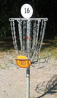 Although early courses were played using trees, fence posts, or park equipment as the target, standard disc golf baskets are by far the most common type of target on modern courses. Some courses feature tone targets that are designed to make a distinctive sound when hit with a disc. Disc golf baskets are constructed with a central pole holding a basket under an assembly of hanging chains. When a disc hits the chains, it is often, but not always, deflected into the basket. Per PDGA rules, in order to complete a hole with a basket target, the disc must "enter the target above the top of the tray and below the bottom of the chain support, and come to rest supported by the target.[16] There are many different brands of baskets made by numerous manufacturers.