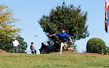 Disc golf is a flying disc sport in which players throw a disc at a target; it is played using rules similar to golf.[2][3] It is usually played on a course with 9 or 18 holes. Players complete a hole by throwing a disc from a tee pad or area toward a target, throwing again from where the previous throw landed, until the target is reached. Usually, the number of throws a player uses to reach each target is tallied (often in relation to par), and players seek to complete each hole in the lowest number of total throws.[3]
